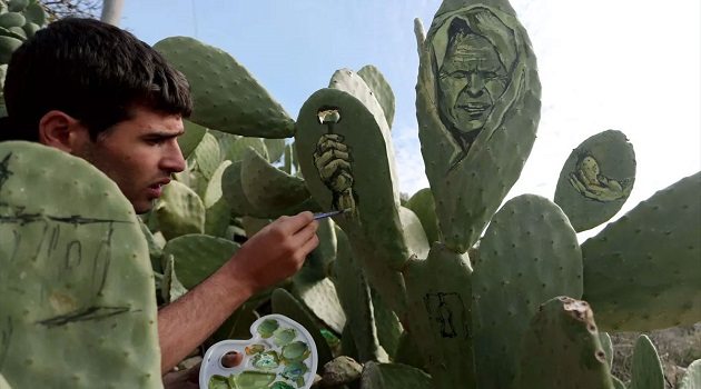 Filistinli ressam Ahmed Yasin, ülkesinde yıllardır süren israil zulmünü ve bu süreçte Filistinliler’in neler yaşadığını, sanatına konu ediniyor. Ancak bunu yaparken bilindik ‘resim‘ sanatından biraz daha farklı bir yaklaşım sergileyen ressam, resimlerini kaktüslerin üzerinde canlandırmayı tercih etmiş.