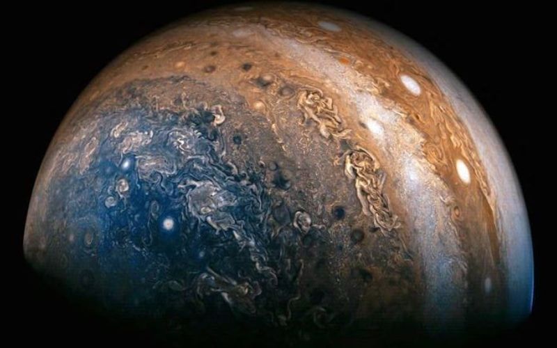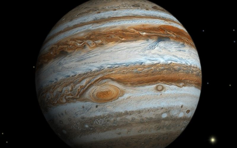 Jüpiter, Güneş Sistemi‘nde Güneş‘ten sonra gelen en büyük kütleli cisim. Kendisinden sonra gelen bütün gezegenlerin toplam kütlesinin yaklaşık 2.5 (İki Buçuk) katı kütleye sahip, devasa bir gezegen. Gökyüzünde çıplak gözle görülebilen en parlak cisimlerden biri oluşundan dolayı insanlığın antik dönemlerinden bu yana varlığı bilinen dev, adını Roma Mitolojisi‘ndeki “tanrıların kralı”, gökyüzü ve gök gürültüsü tanrısı Jüpiter‘den almıştır. Güneş’e uzaklığı bakımından 5. (Beşinci) gezegen olan Jüpiter, muazzam bir gaz devidir.